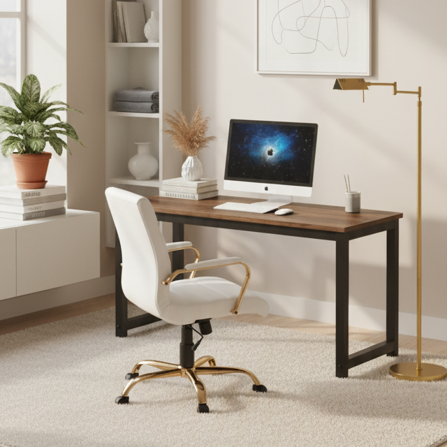 Perfect for those who want a clutter-free environment. A sleek desk, ergonomic chair, and a desk lamp create a stylish yet productive setup.