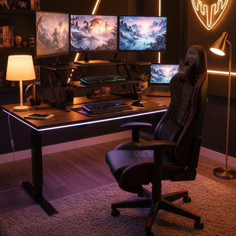 Designed for gamers, streamers, and multitaskers. A wide desk, ergonomic chair, and RGB lighting give you the edge in work and play.